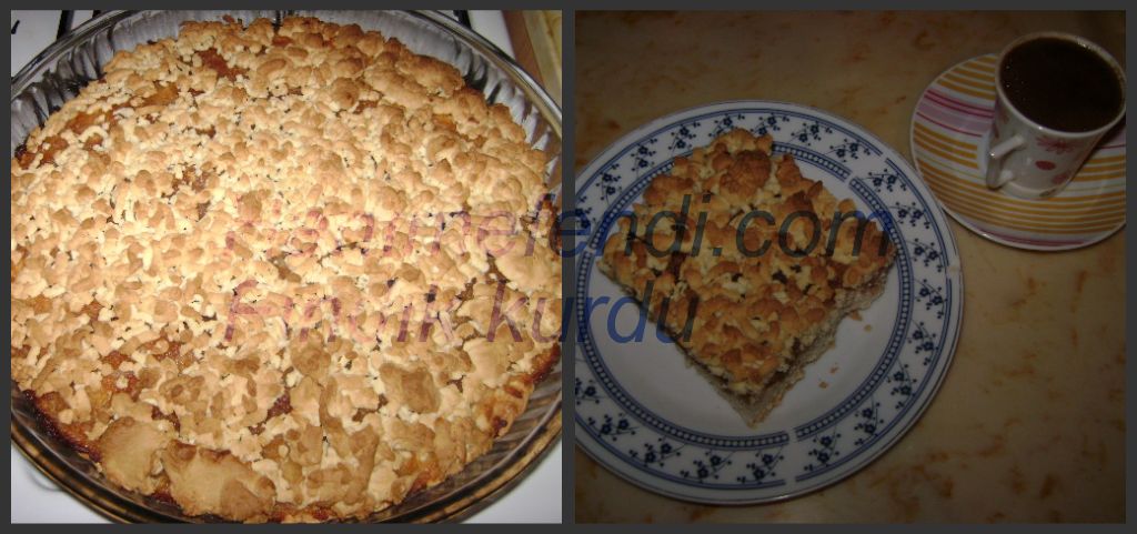 Arası için elmalar rendelenip toz şekerle marmalet kıvamında pişirilir,piştikten sonra tarçını katılır.Ilınınca hamurun üzerine eşit olarak dağıtılır.Daha sonra buzluktaki hamur alınır,bütün tepsinin üzerine rendelenir.175 derece ısıtılmış fırında pişirilir…