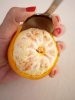 Kaşık yardımıyla çok dikkatli bir şekilde mandalina kabuğuna zarar vermeden çıkarın. Mandalinanın kapuğa bağlandığı ipi sakın kesmeyin!