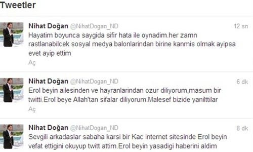 Nihat Doğan ise attığı mesajın doğru olmadığını öğrenince özür diledi.
