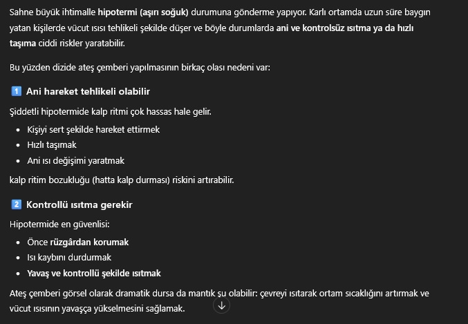 Bu arada tıp bilgim yok diye bu donan kişileri ateş çemberi içine alma mevzusunu merak ettim niye yaptılar da direkt ambulansla götürmediler diye biraz doğru biraz da dizi abartısıymış